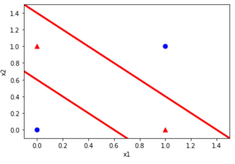 퍼셉트론은 하나의 선형 결정경계를 갖습니다. 그렇기 때문에 XOR과 같이 비선형 결정 경계를 갖는 문제는 풀 수 없는 한계점이 있었습니다. 하지만 두 개 이상의 퍼셉트론을 사용하면 이러한 비선형 결정 경계를 갖는 문제도 풀 수 있게 됩니다. 위와 같이 두 개의 선형 결정 경계를 사용하면 XOR문제를 깔끔하게 해결할 수 있습니다. 실제로 XOR문제는 AND, NAND, OR Gate를 사용해서 풀 수 있습니다. A B Q 0 0 0 1 0 1 0 1 1 1 1 0 앞서 구현한 AND, NAND, OR Gate 함수를 호출해도 동일한 결과를 구할 수 있습니다. def XOR(x1, x2): s1 = NAND(x1, x2) s2 = OR(x1, x2) return AND(s1, s2) 이렇게 XOR은 두 개 ..